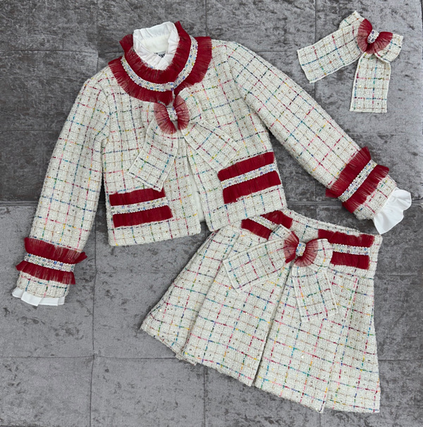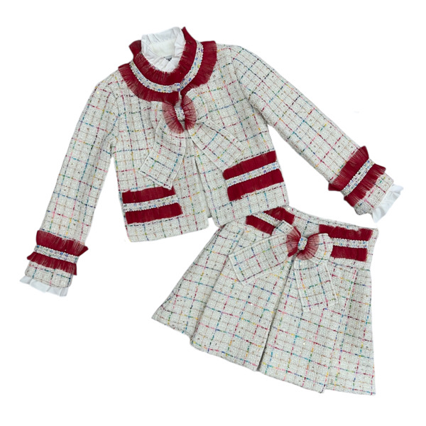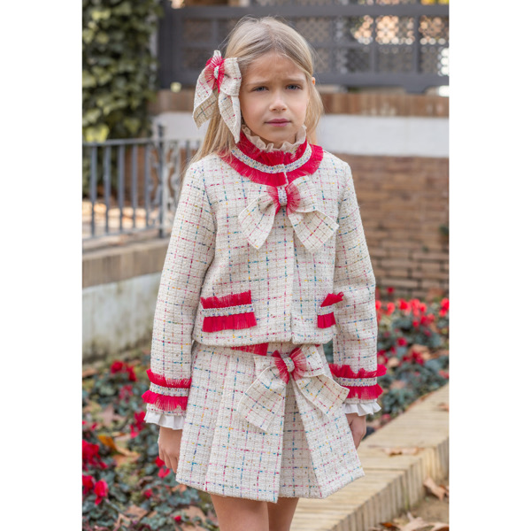 - Beige tweed bow pleat skirt